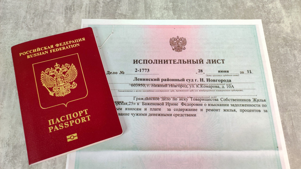 На фотографии изображён заграничный паспорт гражданина Российской Федерации красного цвета с гербом РФ, лежащий на судебном исполнительном листе Ленинского районного суда г. Нижнего Новгорода. Видны реквизиты дела и текст документа. Снимок символизирует правовые ограничения, связанные с долгами и обязанностями граждан. Его можно использовать в публикациях о юридических процедурах, банкротстве и судебных ограничениях.