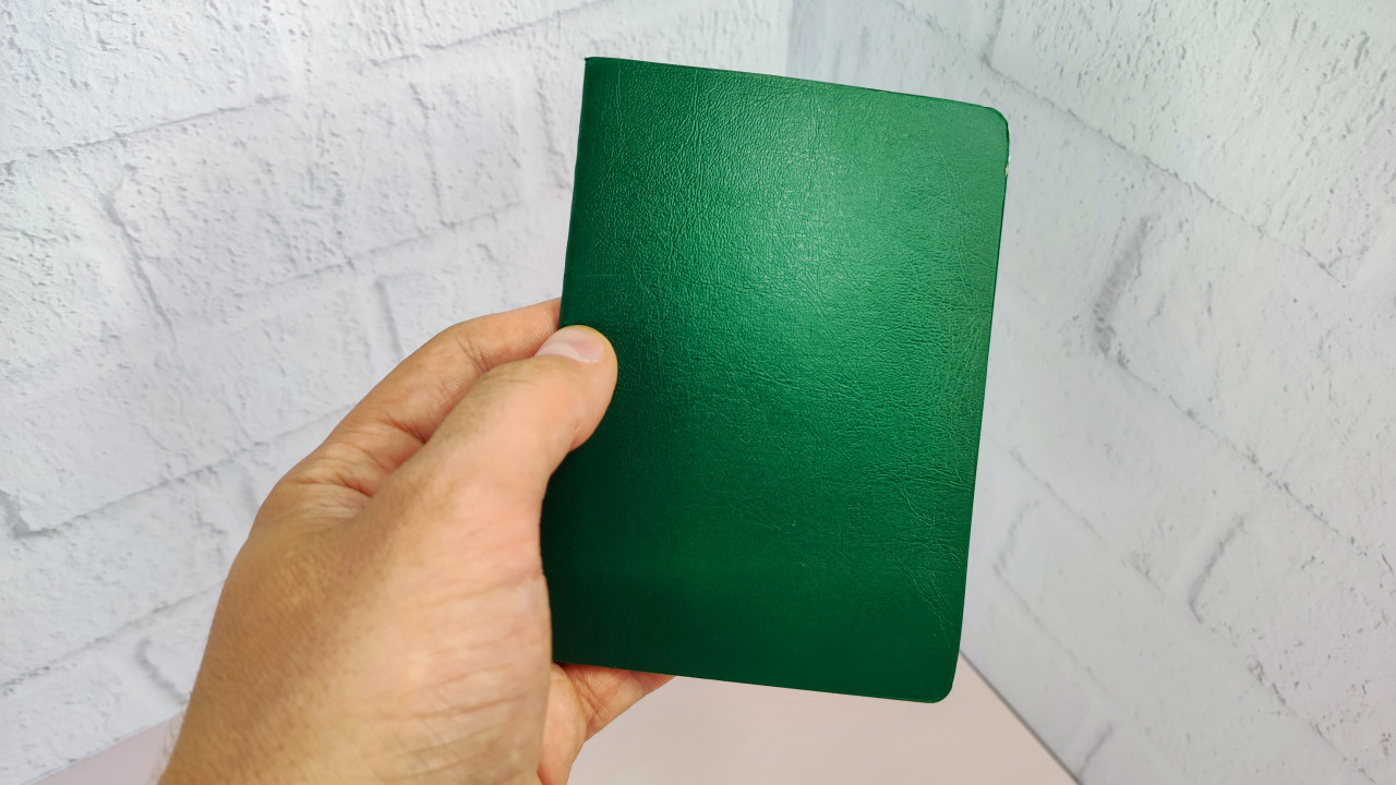 На фотографии изображен паспорт с зеленой обложкой, удерживаемый рукой на фоне стены с текстурой под кирпич. Паспорт занимает центральное место в кадре, видна его гладкая поверхность и прямые углы. Снимок иллюстрирует тему удостоверения личности и оформления документов для поездок, когда паспорт является обязательным атрибутом при пересечении границ. Изображение может быть использовано в статьях о подготовке к поездкам, миграционных процедурах, правилах транспортной регистрации и оформлении виз.