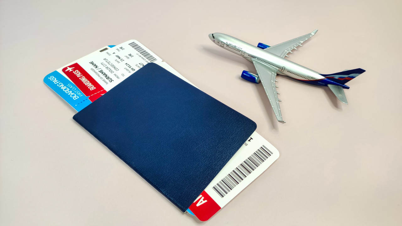 Синий паспорт и посадочные талоны рядом с моделью самолета
