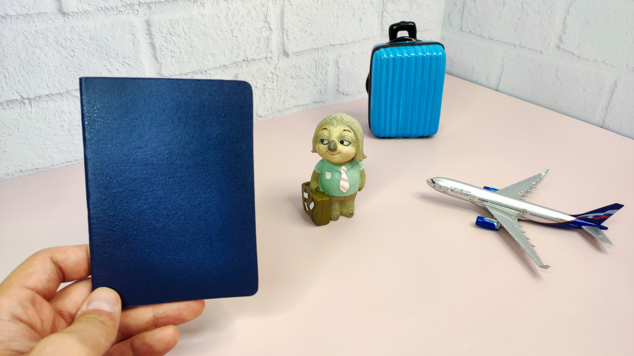Синий паспорт в руке, фигурка с чемоданом и модель самолета