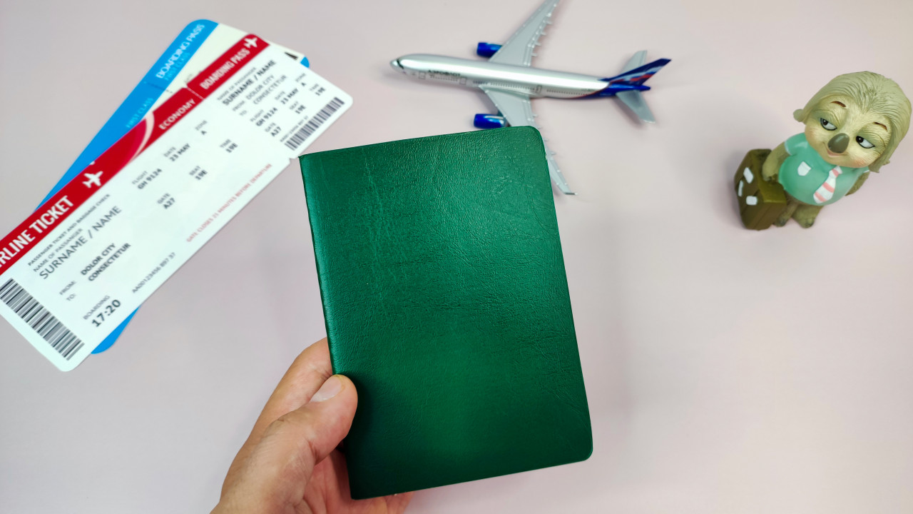 На фотографии изображен паспорт с зеленой обложкой, удерживаемый рукой. Рядом расположены два посадочных талона с указанием рейса, времени вылета и места пассажира. Также в кадре видна модель пассажирского самолета серебристого цвета. На заднем плане присутствует фигурка персонажа с чемоданом. Композиция отражает процесс подготовки к перелету и обязательность наличия паспорта и билетов при пересечении границы. Снимок может использоваться в публикациях о визовых процедурах, международных поездках, работе авиакомпаний и транспортной логистике.
