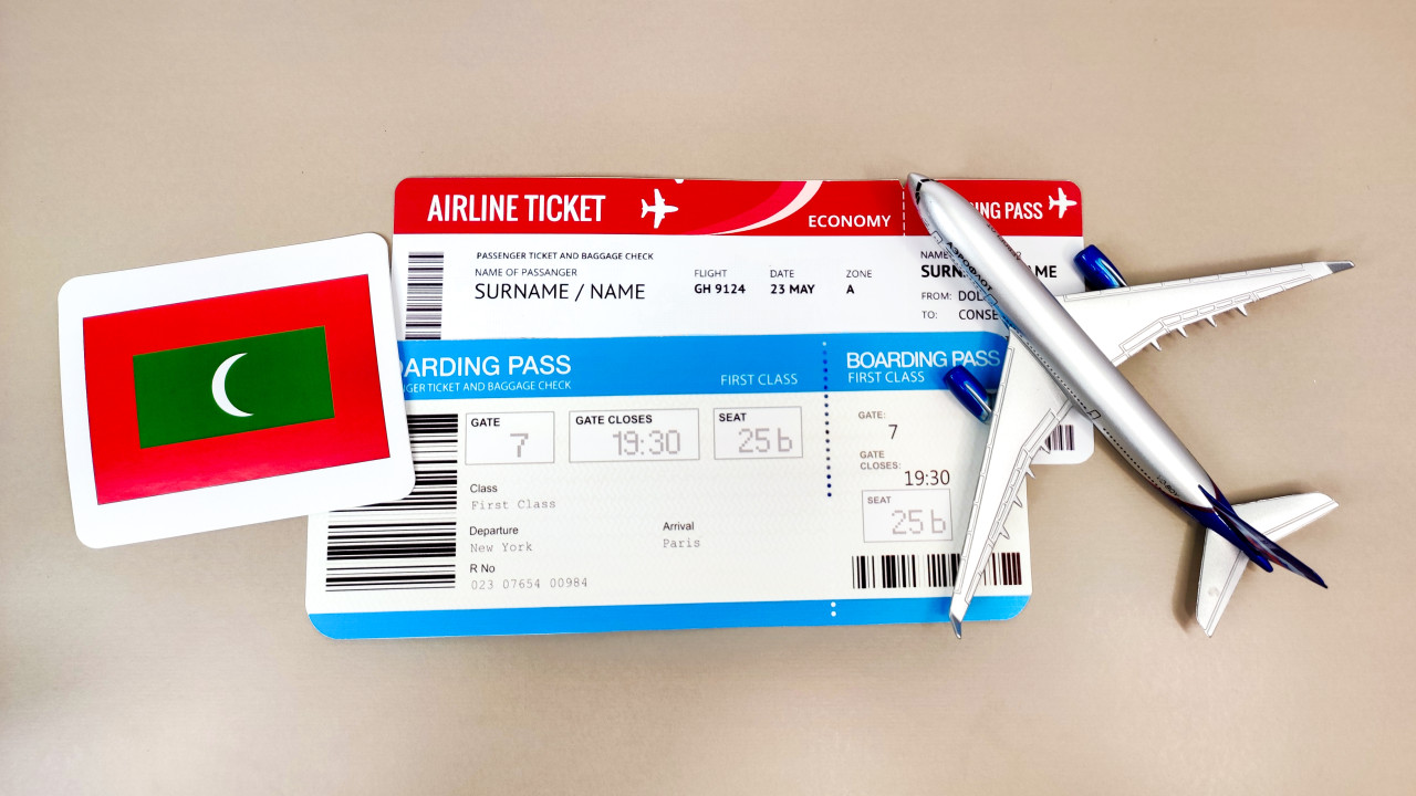 На фото показана карта с изображением государственного флага Мальдивской Республики, два посадочных талона, а также модель самолёта на светлом фоне. Флаг Мальдив был утверждён в 1965 году, он включает зелёное поле с белым полумесяцем и красную рамку. Снимок отражает тему международных перелётов и туристических поездок на острова.