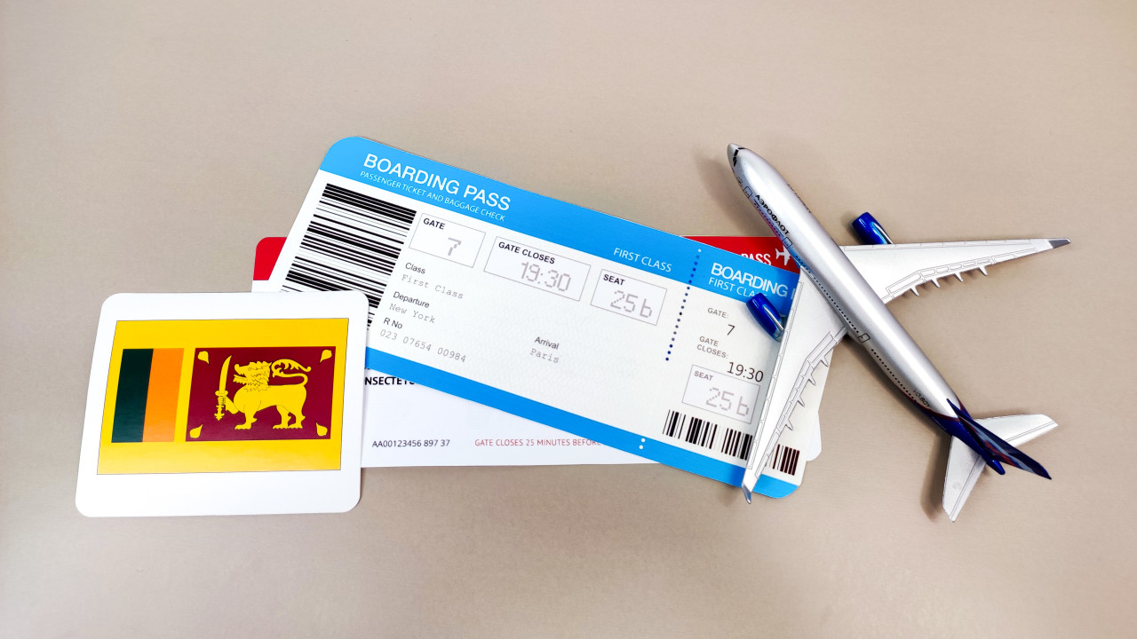На фотографии показана карта с изображением государственного флага Шри-Ланки, два посадочных талона и модель самолёта на светлом фоне. Флаг Шри-Ланки был официально принят в 1951 году, он включает золотого льва с мечом на красном фоне и символизирует национальную идентичность страны. Снимок отражает тему международных перелётов и туристических поездок на Шри-Ланку.