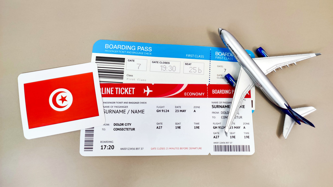 На фото изображена карта с изображением государственного флага Туниса, рядом расположены авиабилеты разных классов и модель самолёта. Флаг Туниса был утверждён в 1831 году и символизирует исламскую традицию и историческое наследие страны. Снимок подчёркивает тематику перелётов и туристических поездок в Северную Африку.