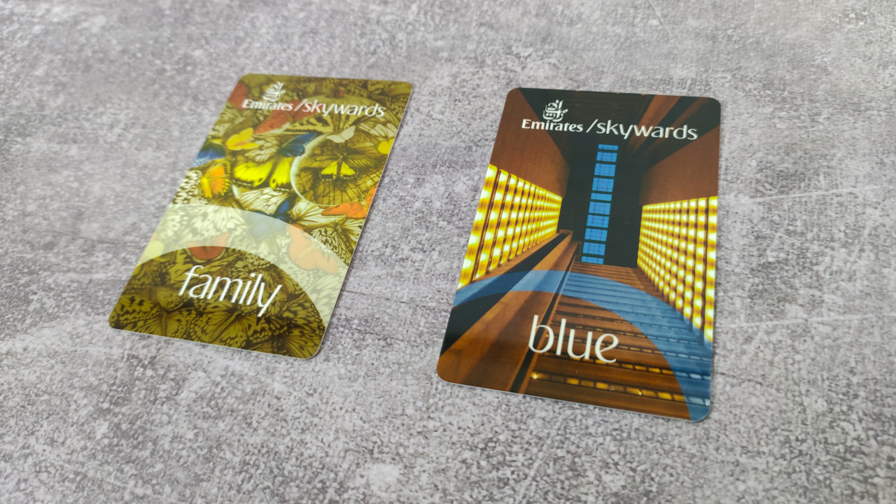 Фотография демонстрирует две карты программы Emirates Skywards, размещённые на серой поверхности. Карта Family имеет фон с множеством изображений бабочек, карта Blue оформлена в стиле освещённого коридора. Оба дизайна отражают фирменный стиль авиакомпании Emirates. Снимок может быть использован в статьях и презентациях о программах лояльности, авиаперелётах и накоплении бонусных миль.
