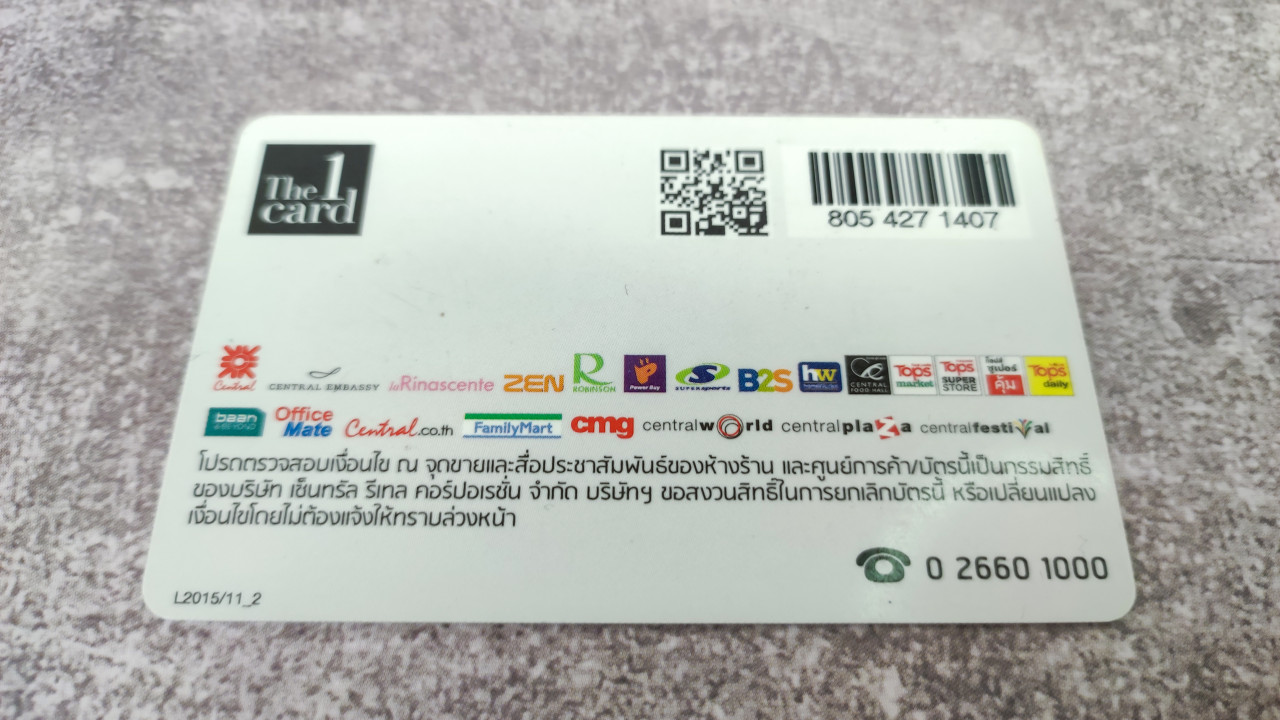 карта лояльности бонусная карта пластиковая карта membership card карта покупателя карта клиента клубная карта дисконтная карта программа лояльности бонусная программа клиентская программа торговая сеть услуги компании The 1 Card скидочная карта обратная сторона штрихкод QR код логотипы магазинов торговые сети Central Robinson FamilyMart Tops B2S Power Buy Supersports Central Festival Central World карта на столе клиентская карта торговая группа ТаиландПохожие фотографии