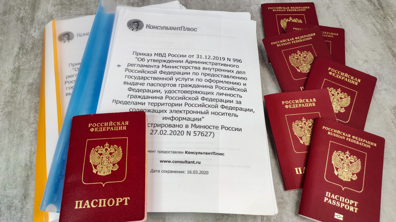 На фото изображён приказ МВД России от 31.12.2019 №996, напечатанный и вложенный в пластиковую папку. Рядом разложены несколько заграничных паспортов Российской Федерации красного цвета. Документ касается регламента оказания госуслуг по выдаче паспортов нового поколения. На переднем плане виден паспорт РФ. Снимок демонстрирует юридическую базу и нормативные акты, связанные с паспортной системой. Подходит для материалов о законах, госуслугах и правовых изменениях.