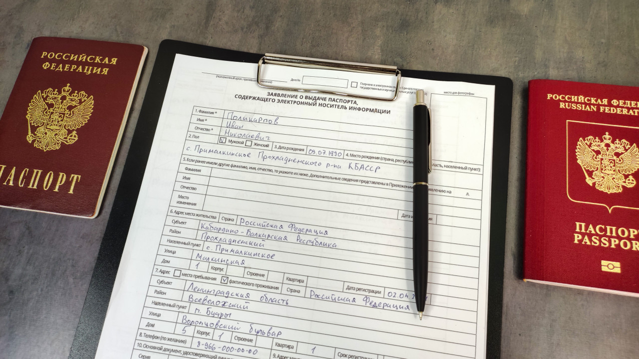 На фото изображён бланк заявления о выдаче заграничного паспорта гражданина Российской Федерации с заполненными полями, включая личные данные и адреса регистрации. Документ закреплён на планшете с металлическим зажимом, рядом лежит чёрная ручка. Слева и справа видны обложки российских паспортов — внутреннего и заграничного. Снимок иллюстрирует процесс подачи заявления через МВД или портал госуслуг и может использоваться для материалов о миграционных процедурах, правилах получения загранпаспорта и подтверждении данных граждан.