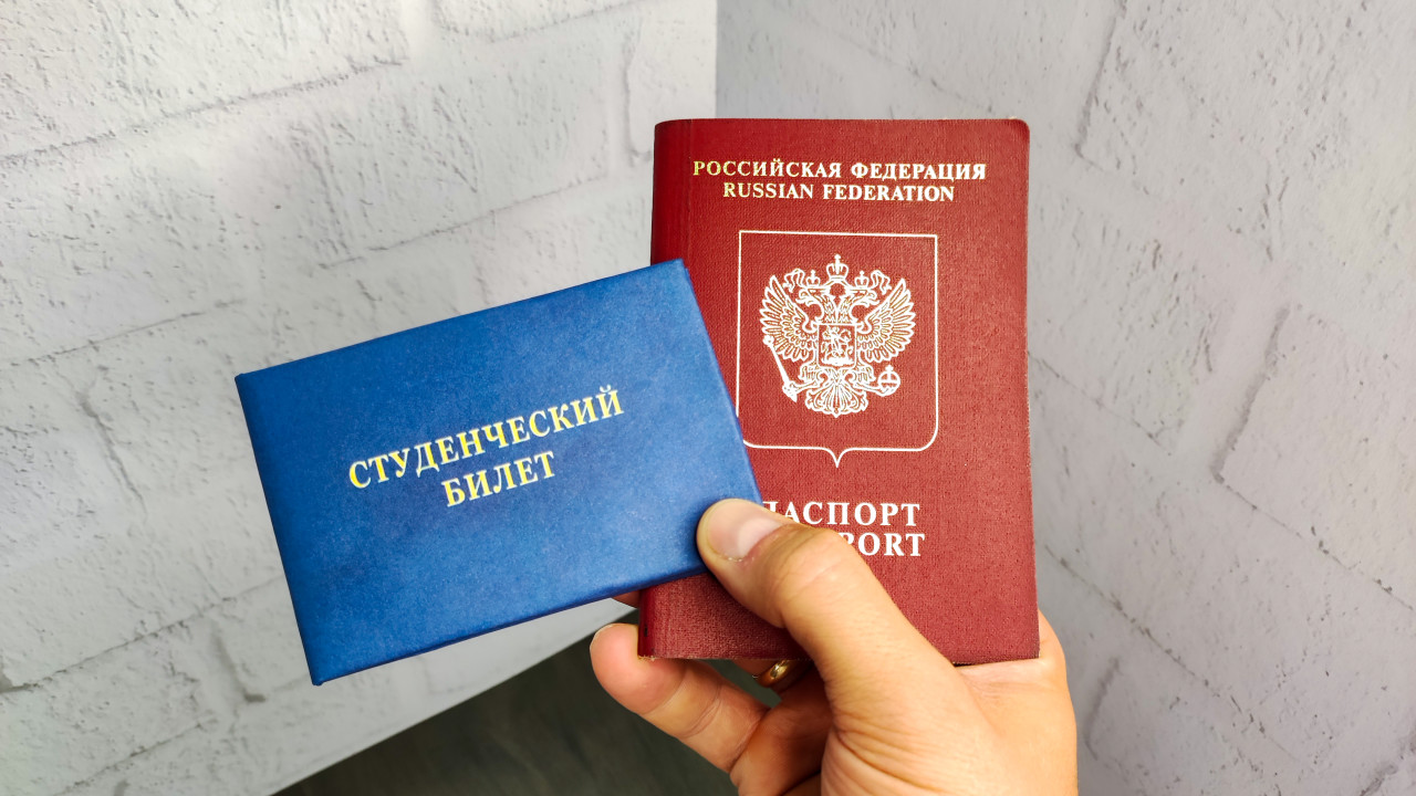 Фотография демонстрирует руку, удерживающую два документа: синий студенческий билет с золотой надписью и заграничный паспорт Российской Федерации бордового цвета с золотым гербом. Фон светлый, выполнен в нейтральных серых тонах, что подчёркивает контраст объектов. Кадр может быть использован для статей о студенческой мобильности, необходимости наличия паспорта у студентов для поездок за границу, а также о подтверждении личности и оформлении документов.