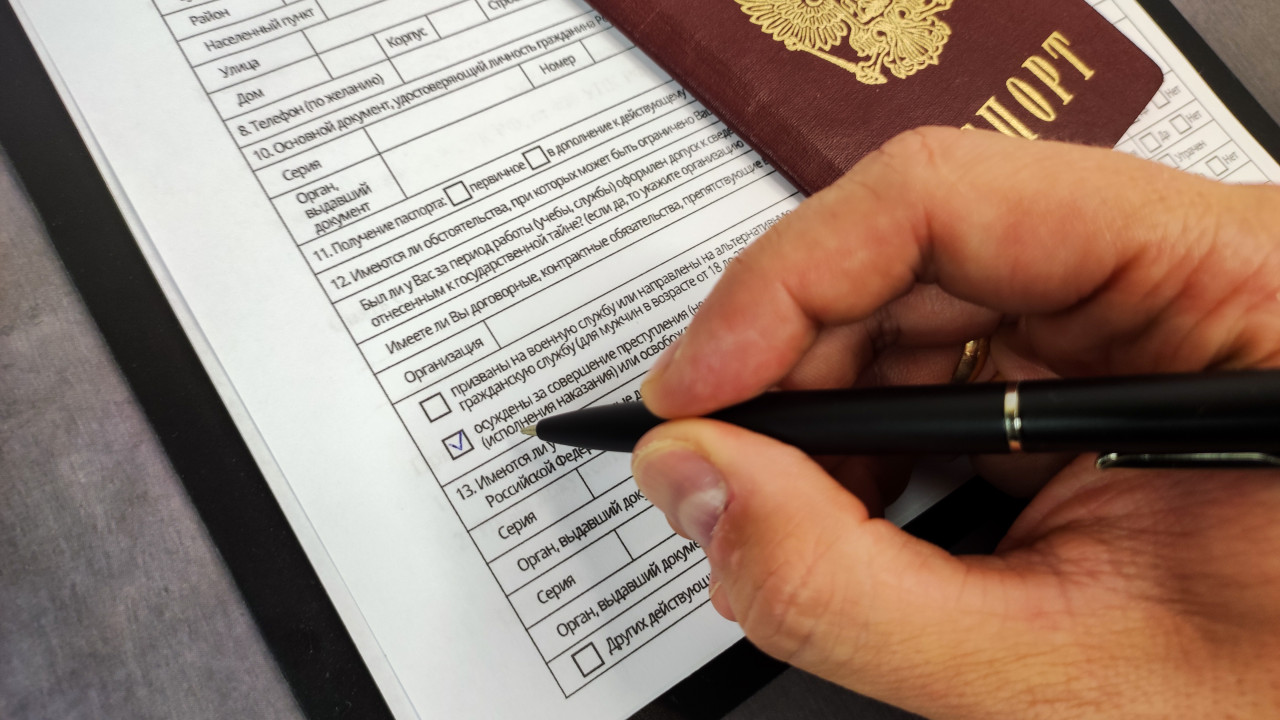 На фото изображена часть анкеты для оформления заграничного паспорта гражданина РФ. В кадре видна рука человека с ручкой, который отмечает пункт о наличии судимости. Рядом на столе лежит обложка загранпаспорта РФ бордового цвета с гербом. Сцена подчеркивает важность честного указания сведений при подаче документов на выезд за границу. Фотография может использоваться в статьях и материалах о миграционном праве, выезде за границу и юридических ограничениях.