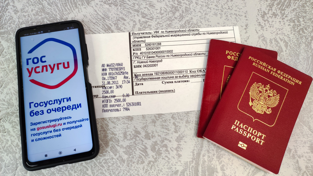 На фотографии показана квитанция с реквизитами для оплаты госпошлины за выдачу загранпаспорта в России. Рядом лежат два загранпаспорта Российской Федерации бордового цвета с гербом. Слева расположен смартфон с приложением «Госуслуги», демонстрирующим надпись о получении услуг без очереди. Снимок иллюстрирует процесс оформления заграничных документов, включая необходимость финансовых операций и использование цифровых сервисов.