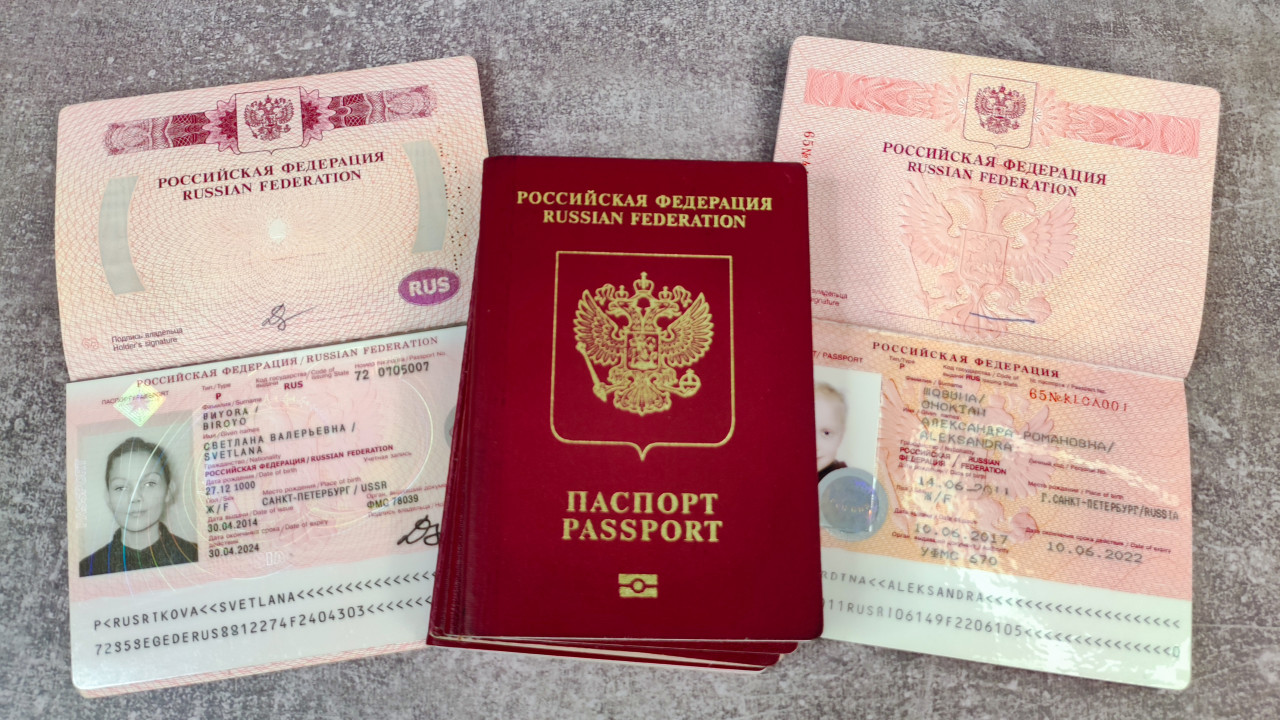 На фотографии показаны два открытых заграничных паспорта граждан Российской Федерации с личными данными и фотографиями владельцев, а между ними расположен закрытый паспорт в красной обложке с золотым гербом и надписью «Паспорт». Изображение иллюстрирует оформление документов для международных поездок, подтверждение личности и необходимость наличия загранпаспорта для пересечения границы. Такой кадр может использоваться в материалах о визах, поездках, миграционных процедурах или юридических вопросах, связанных с документами.