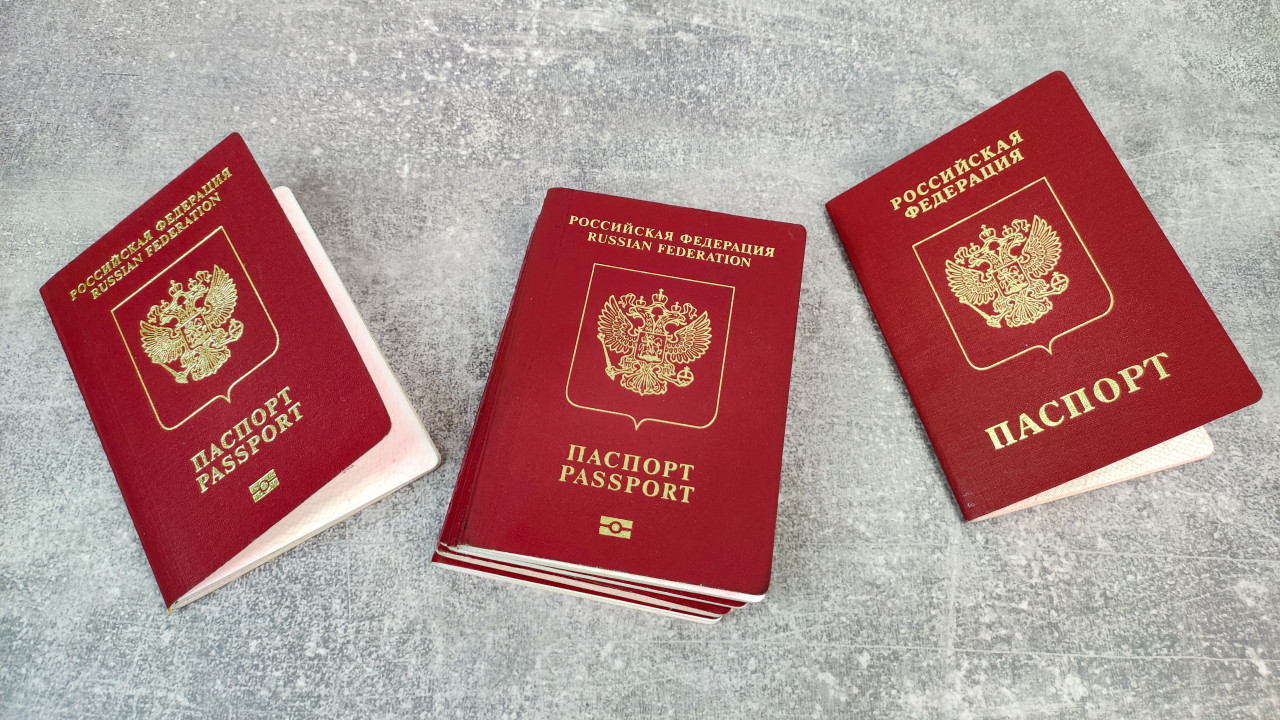 На фотографии изображены три заграничных паспорта Российской Федерации с красными обложками и золотым гербом. Документы расположены на серой поверхности: один лежит под углом, второй — в центре в закрытом виде, а третий — справа. Такие изображения могут применяться в публикациях о международных поездках, подготовке к визовым процедурам, вопросах получения паспорта или его замены, а также в материалах о безопасности личных документов.