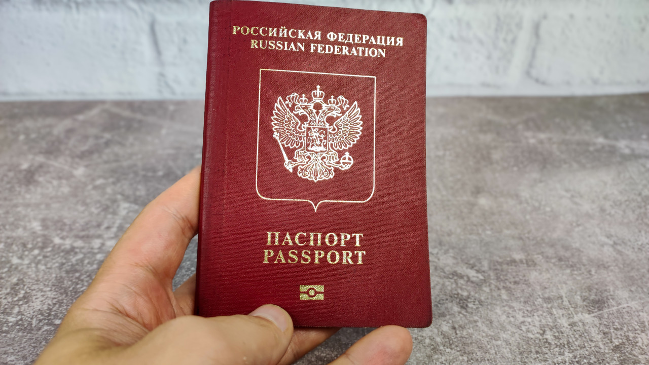 На снимке изображён заграничный паспорт гражданина Российской Федерации в красной обложке с золотым гербом, который держат в руке. Фон представлен серой поверхностью. Подобные изображения применяются в публикациях о международных поездках, визовых процедурах, а также в материалах о правилах идентификации личности и государственных документах.
