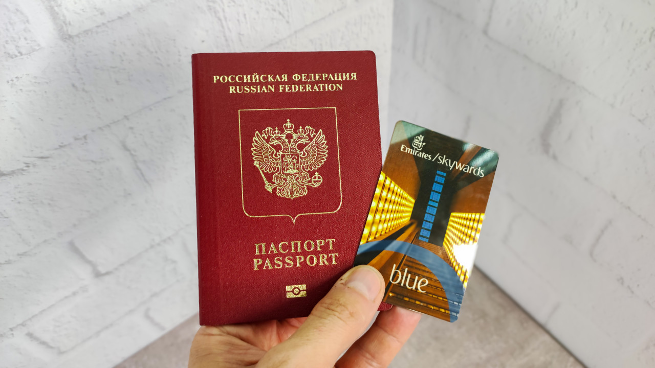 Российский загранпаспорт и карта Emirates Skywards Blue на фоне стены