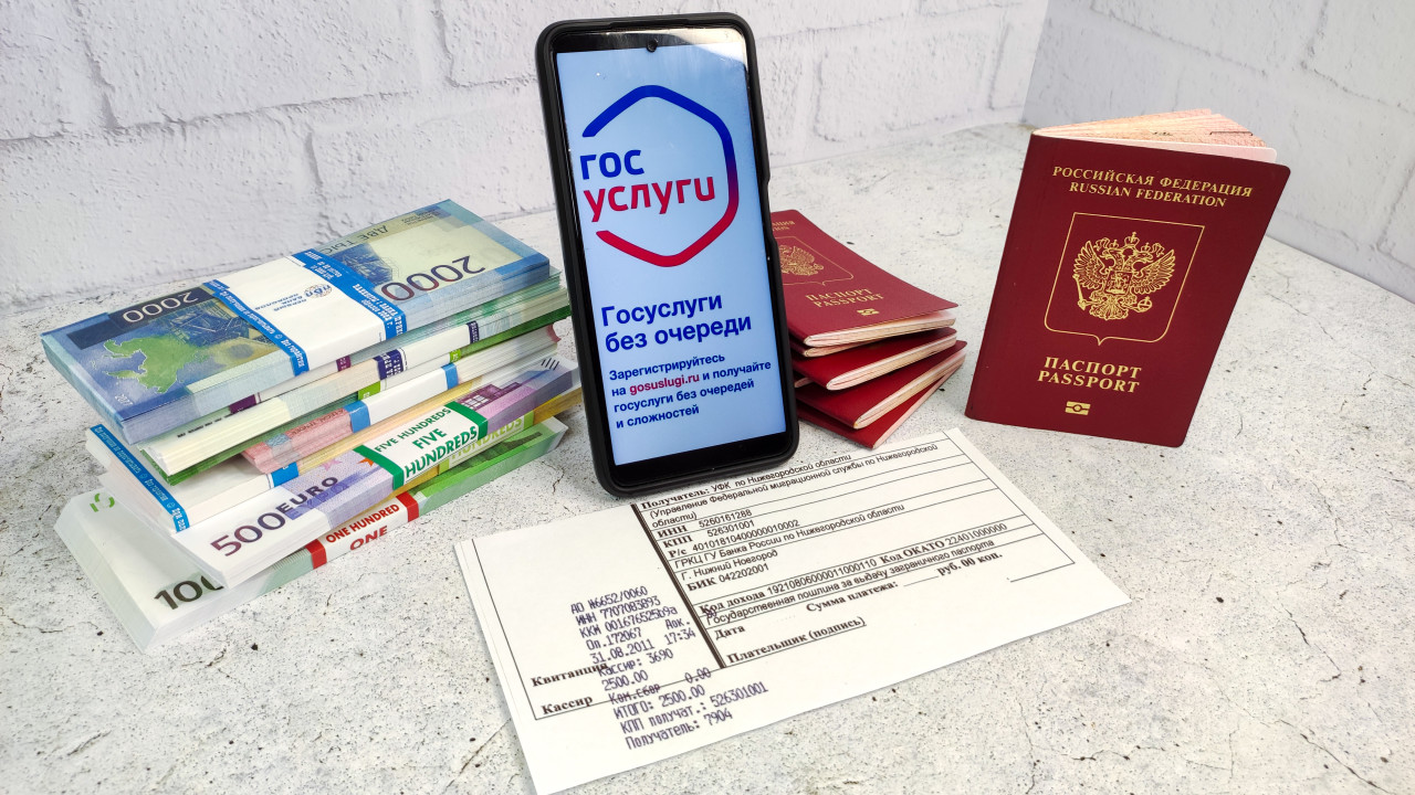 Евро и российские паспорта с квитанцией и Госуслуги на смартфоне