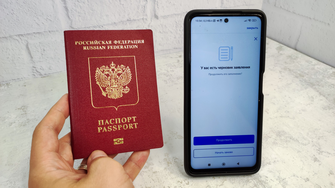 На фото изображён заграничный паспорт гражданина Российской Федерации, удерживаемый рукой, рядом со смартфоном. На экране телефона отображается интерфейс мобильного приложения «Госуслуги» с уведомлением о наличии черновика заявления. Сцена снята на светлом фоне и подчёркивает взаимодействие бумажных документов с современными электронными сервисами. Изображение может использоваться в материалах о цифровизации государственных услуг, подтверждении личности и подаче заявлений онлайн.