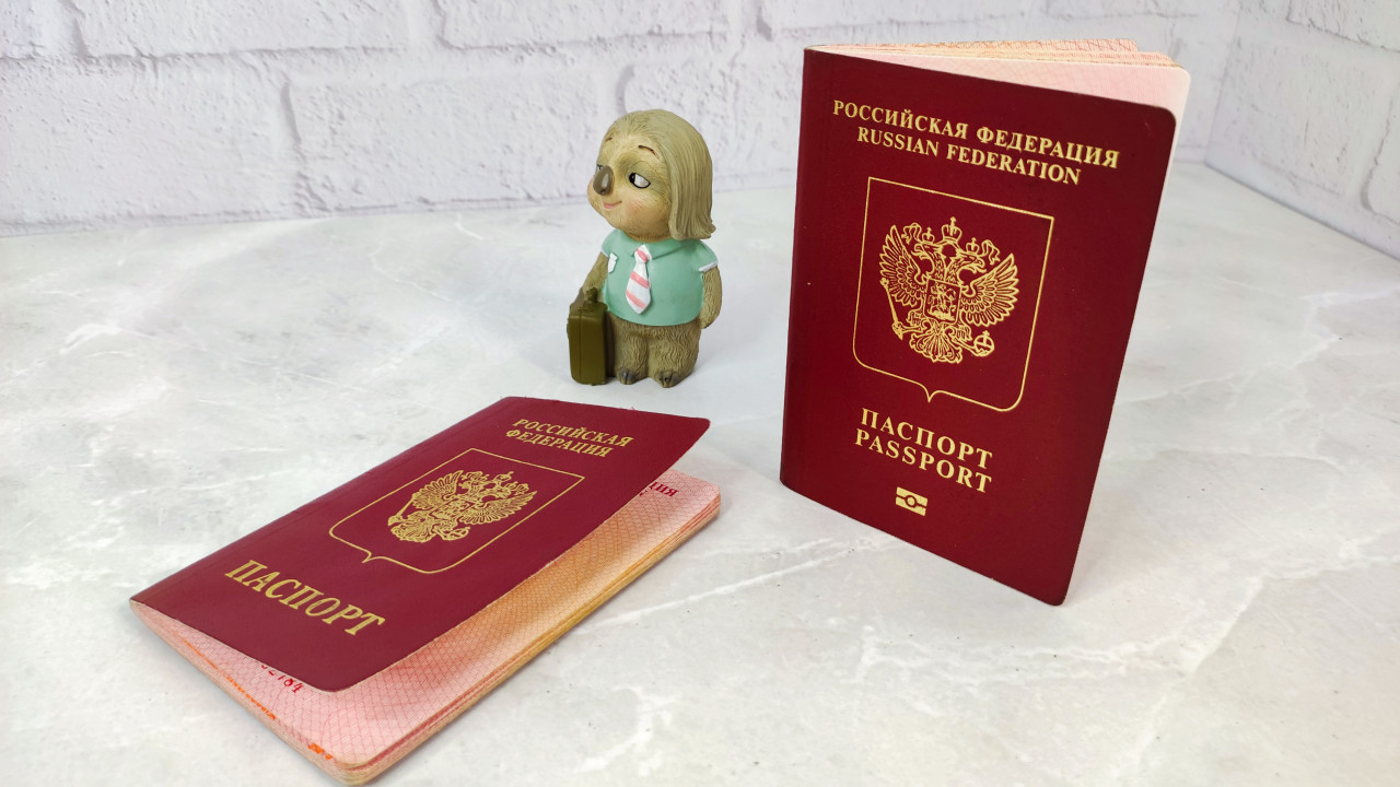 Загранпаспорт РФ и фигурка персонажа с чемоданом