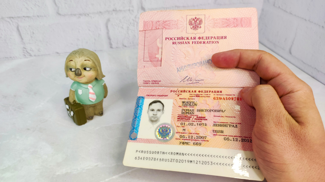 Разворот загранпаспорта РФ с фото и фигурка персонажа с чемоданом