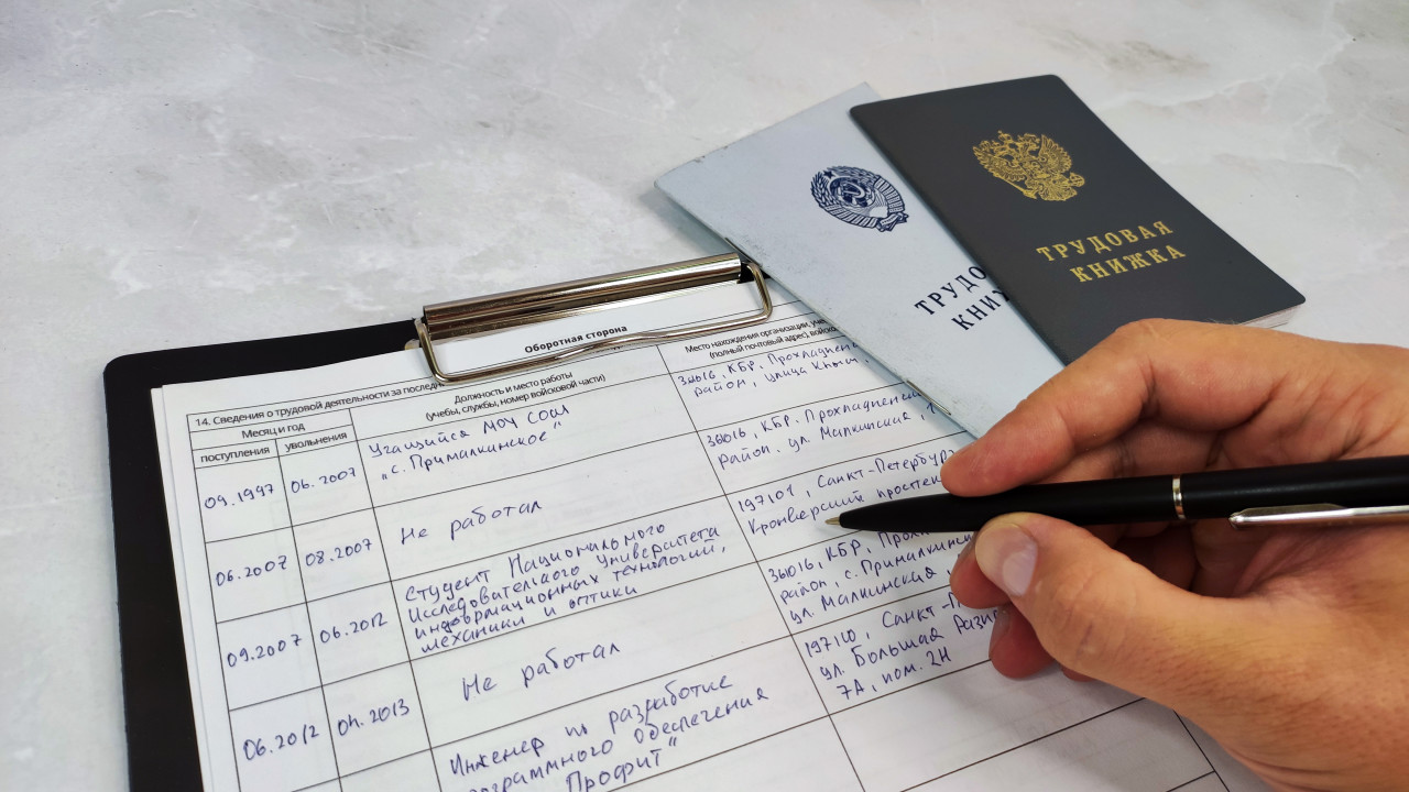 На фотографии изображён процесс заполнения анкеты на загранпаспорт старого образца, в частности раздела со сведениями о трудовой деятельности за последние 10 лет. В таблице перечислены периоды учёбы, работы и отсутствия трудоустройства. Правая часть кадра фиксирует руку человека с ручкой, указывающего на записи. На столе рядом лежат трудовые книжки двух образцов: светло-голубая советского времени и современная тёмно-серая. Кадр иллюстрирует документальное подтверждение стажа и опыта работы при подаче заявления на загранпаспорт. Фотография подходит для материалов о миграции, трудовом праве и госуслугах.