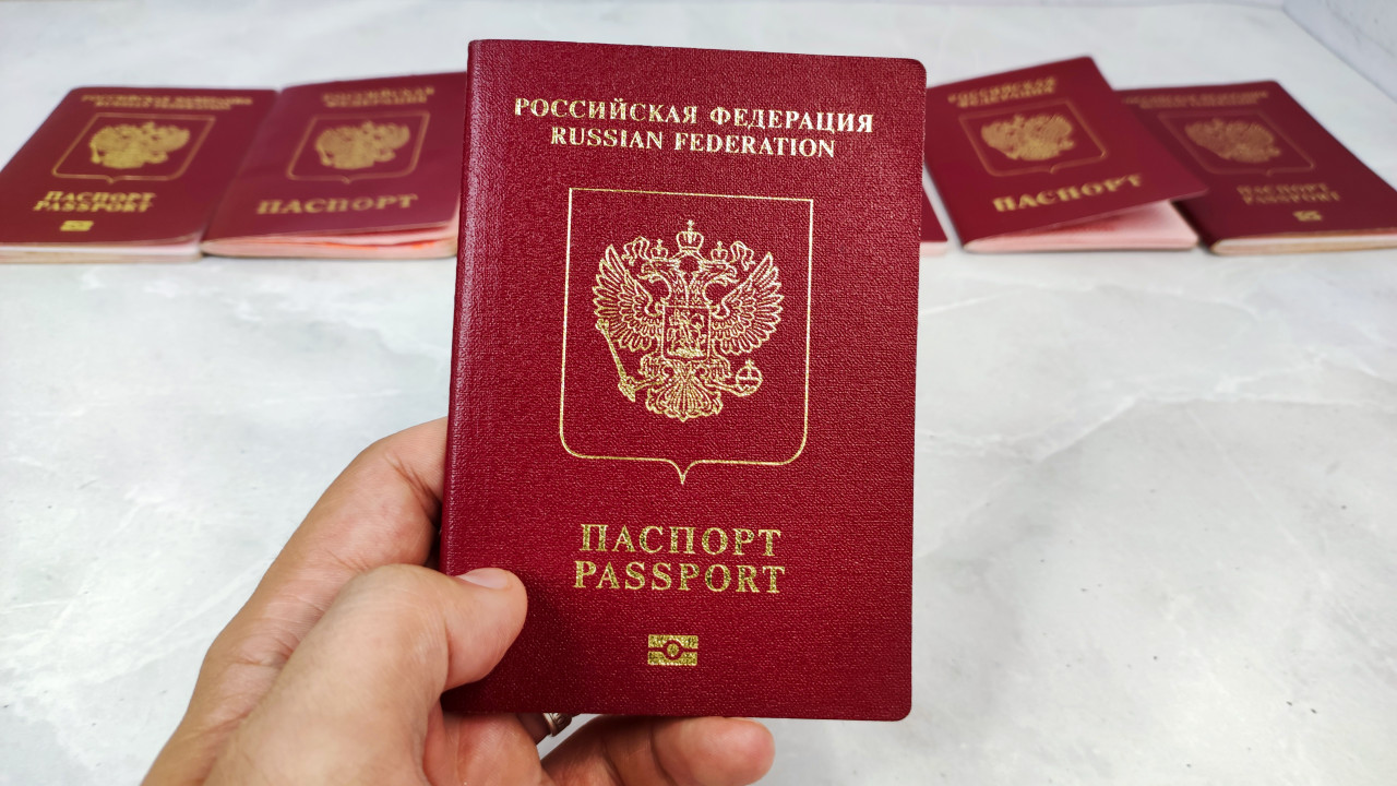 На снимке изображён заграничный паспорт Российской Федерации бордового цвета с золотым гербом, который удерживается рукой. На заднем плане на светлой поверхности разложены ещё несколько аналогичных паспортов, расположенных в ряд. Фото иллюстрирует тему личных документов гражданина, получения и использования загранпаспортов для поездок за границу, а также процесс замены или хранения паспортов.