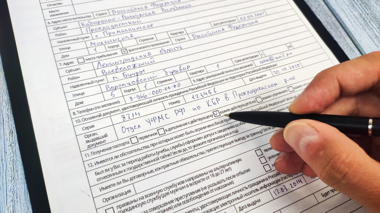 На фотографии изображена рука человека с черной ручкой, заполняющего анкету для оформления заграничного паспорта гражданина Российской Федерации. В документе видны поля для персональных данных, адреса проживания, серии и номера паспорта, а также органа, выдавшего удостоверение личности. Бумажный бланк заполнен синими чернилами от руки. Снимок акцентирует внимание на процессе подачи заявления и подчеркивает важность правильного внесения информации при оформлении загранпаспорта. Фотография может использоваться в материалах о визах, миграционном учете, услугах УФМС и правилах международных поездок.