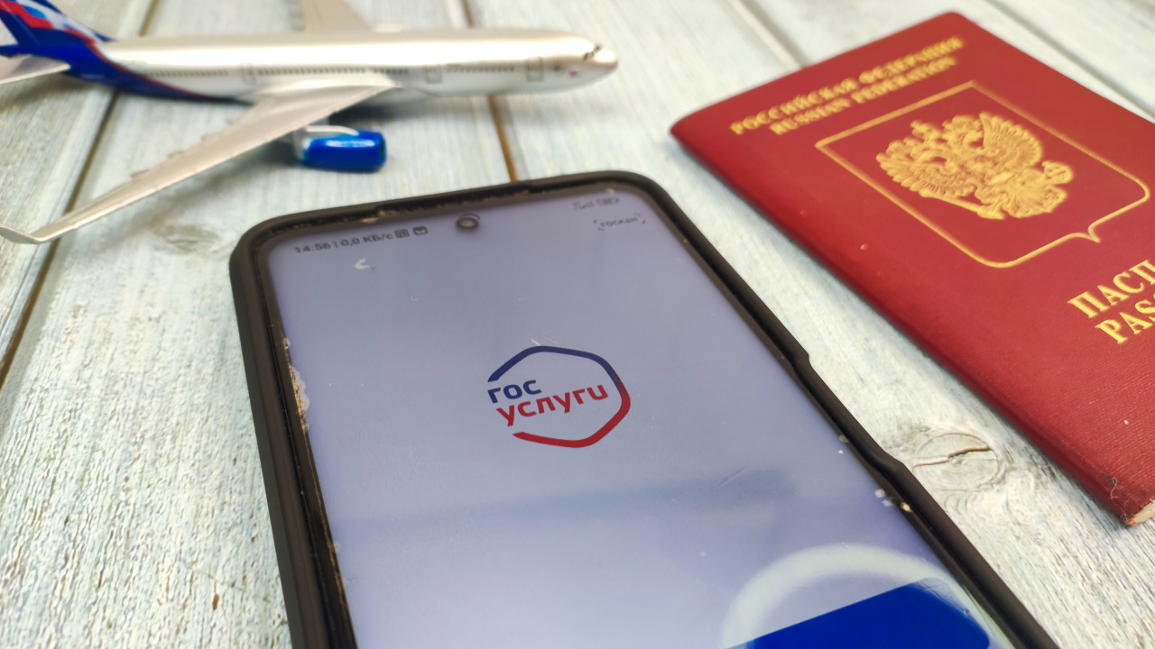 На фото изображен смартфон с открытым экраном приложения «Госуслуги», рядом с которым лежит закрытый заграничный паспорт Российской Федерации. На деревянной поверхности также находится модель самолета авиакомпании «Аэрофлот». Снимок акцентирует внимание на цифровых сервисах для оформления документов, виз и загранпаспортов, подчеркивая удобство онлайн-услуг. Изображение может использоваться в материалах о госуслугах, современных технологиях, авиационных перевозках и международных поездках.
