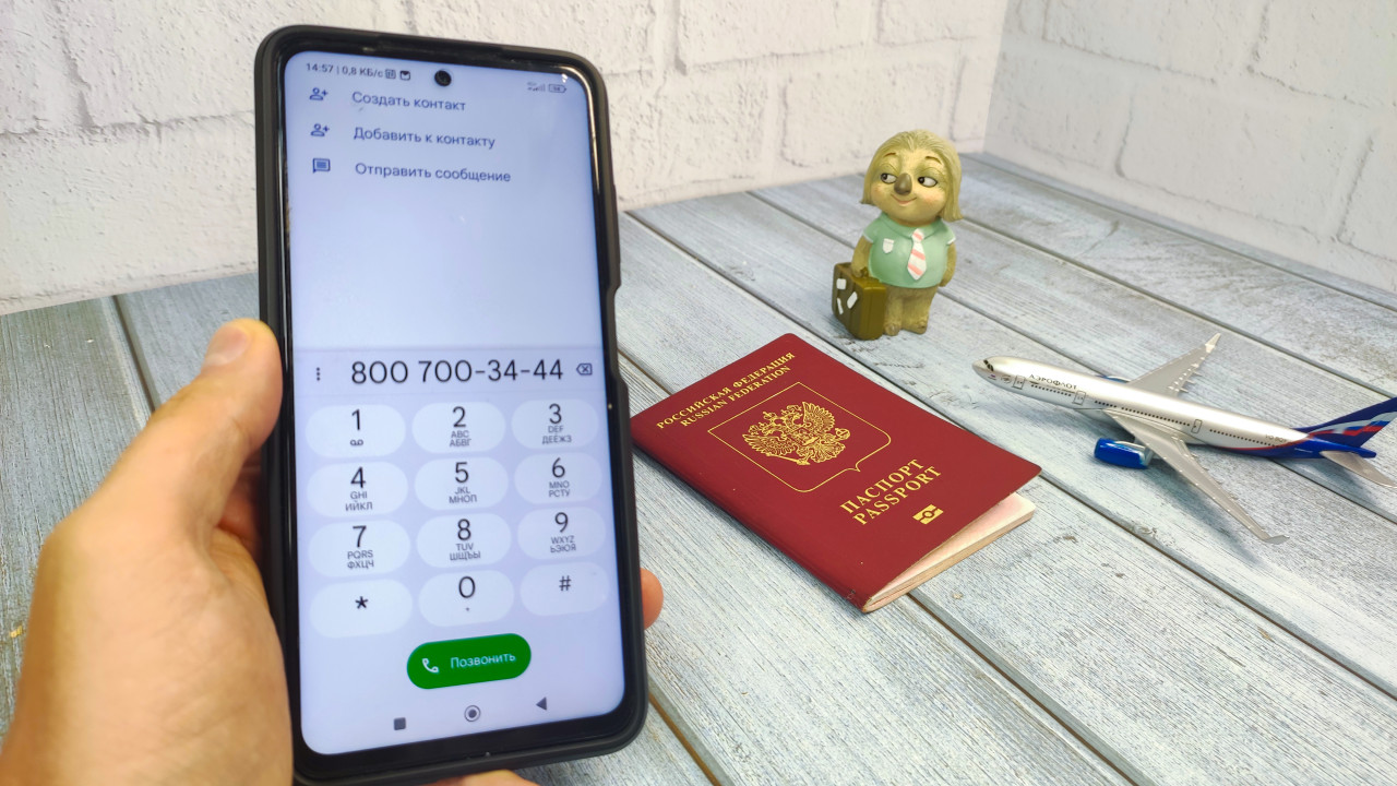 На фото изображена рука человека, держащая смартфон с набранным номером 8-800-700-34-44. На заднем плане на деревянной поверхности расположен заграничный паспорт Российской Федерации, рядом модель самолета авиакомпании «Аэрофлот» и фигурка мультяшного ленивца с чемоданом. Изображение подчеркивает тему оформления документов, связи с госуслугами и международных поездок.