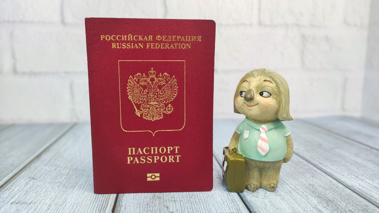 Заграничный паспорт Российской Федерации и фигурка ленивца с чемоданом