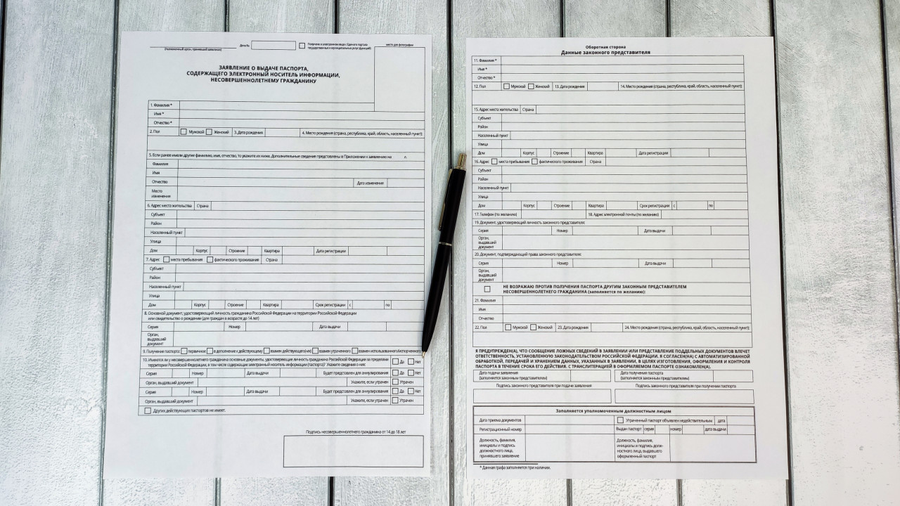На фото показаны два пустых бланка заявления на получение заграничного паспорта, содержащего электронный носитель информации для несовершеннолетнего гражданина Российской Федерации. Документы разложены на столе, рядом положена черная ручка. На бланках видно множество полей для заполнения: фамилия, имя, отчество, дата рождения, данные о месте жительства, а также информация о законных представителях. Снимок отражает процесс подготовки документов для получения паспорта ребенком и может быть использован в иллюстрациях к юридическим и миграционным материалам.