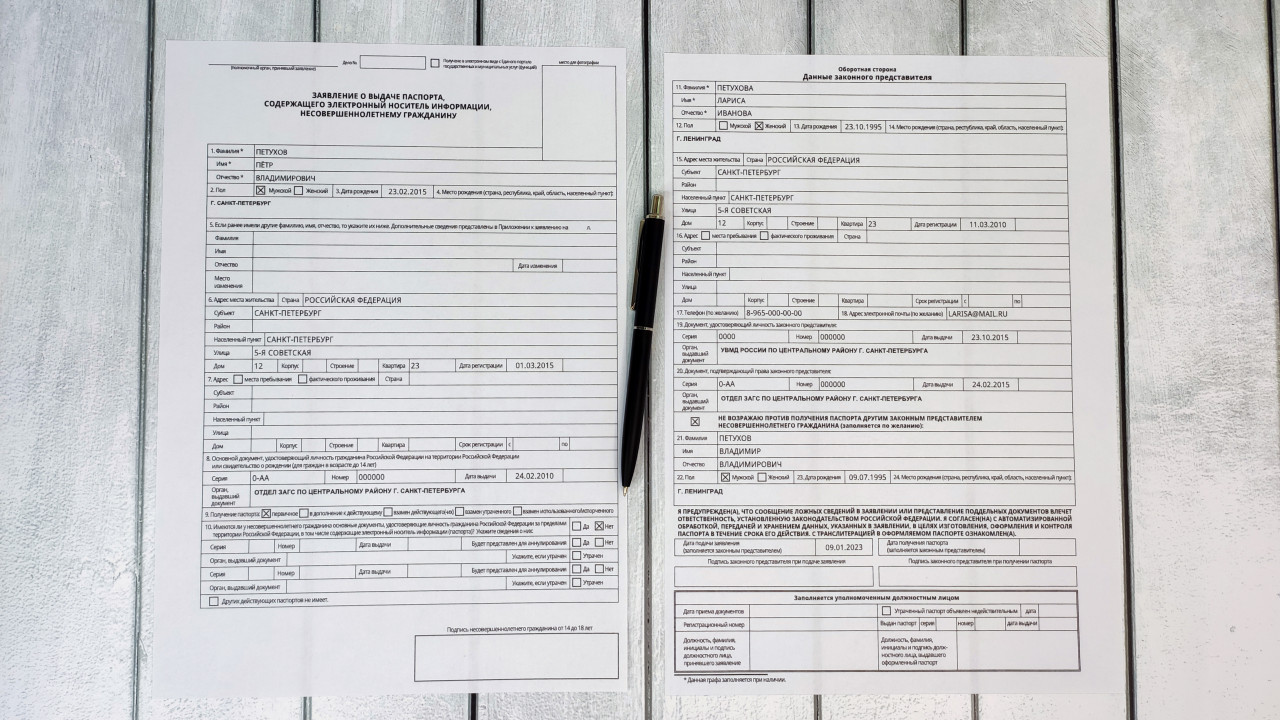 На фотографии изображена заполненная анкета на выдачу заграничного паспорта для несовершеннолетнего гражданина РФ. В документе указаны данные ребенка, включая фамилию, имя, отчество, дату рождения и адрес проживания, а также информация о законных представителях. Бланки разложены на поверхности стола, рядом лежит ручка. Снимок демонстрирует процесс подачи документов и может использоваться в публикациях о правилах оформления паспортов, особенностях получения загранпаспортов детьми и работе паспортных подразделений.