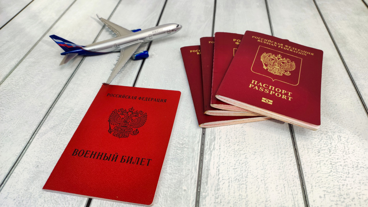 На изображении показан военный билет красного цвета с гербом Российской Федерации, рядом лежат несколько заграничных паспортов бордового цвета с двуглавым орлом и надписями. На фоне размещена модель самолета «Аэрофлот», символизирующая международные поездки. Композиция подчеркивает связь между воинскими документами и необходимыми для выезда заграничными паспортами. Фото может быть использовано для иллюстраций о миграции, путешествиях, правовом статусе граждан и обязанностях военнообязанных лиц.