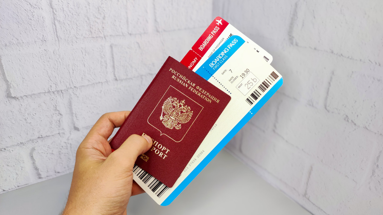 На фото изображена рука, держащая заграничный паспорт гражданина Российской Федерации бордового цвета и два посадочных талона. На билетах указаны время вылета, номер выхода на посадку и место пассажира. Фон с кирпичным узором подчеркивает официальную направленность снимка. Фото иллюстрирует подготовку к авиаперелету и использование документов для регистрации.
