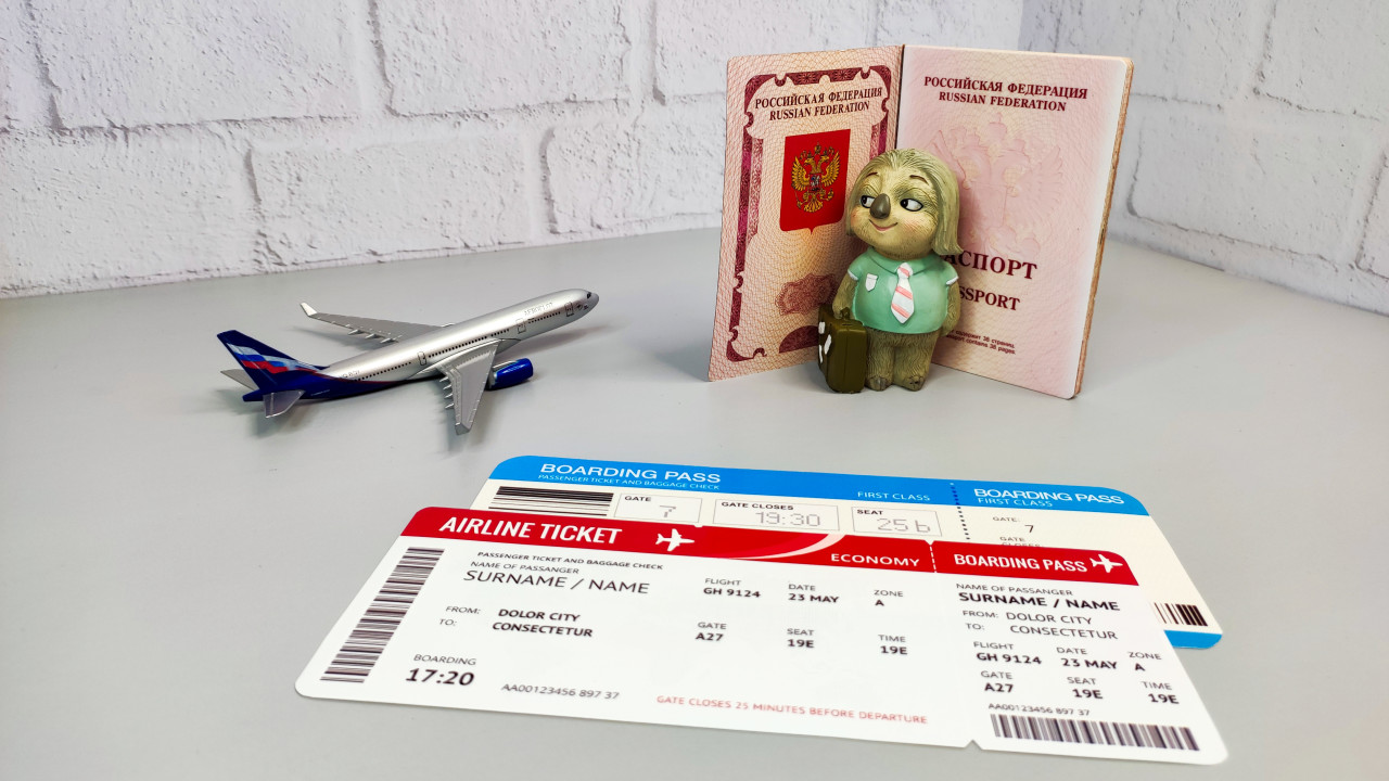 На фотографии изображен заграничный паспорт Российской Федерации, открытый на первой странице, рядом расположены два посадочных талона и модель самолета. В кадре также фигурка персонажа с чемоданом, символизирующая тему путешествий. На билетах указаны данные рейсов, включая время отправления и места пассажиров. Снимок иллюстрирует подготовку к международной поездке и может использоваться в материалах о визовых процедурах и перелетах.