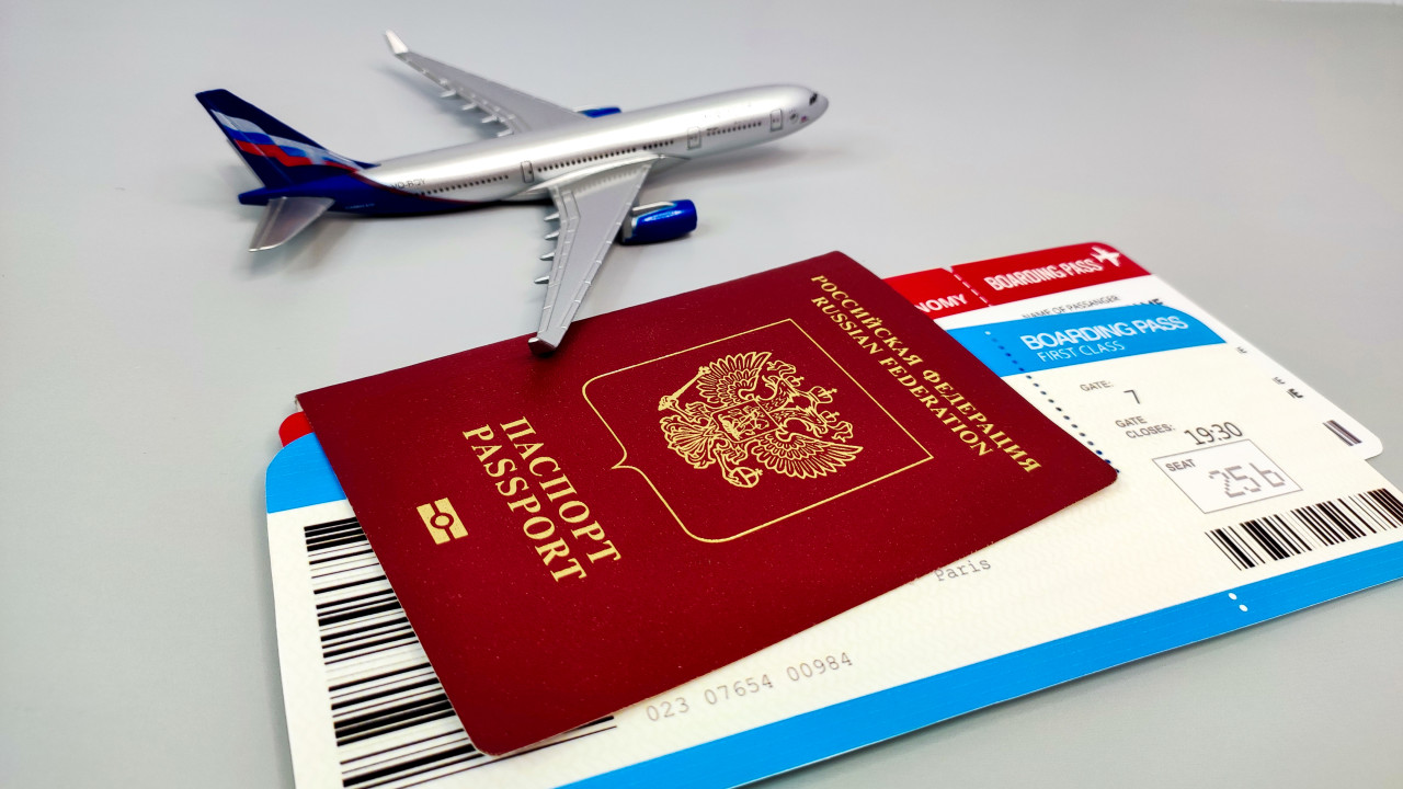 Заграничный паспорт РФ и авиабилет рядом с моделью самолета