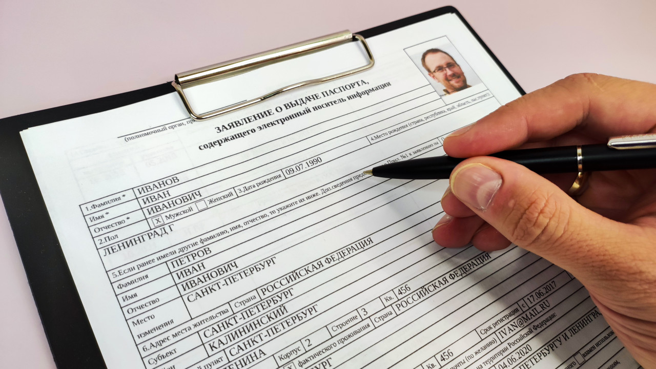 На фотографии изображена рука человека с ручкой, которая указывает на бланк заявления о выдаче заграничного паспорта с электронным носителем информации. В верхней части анкеты видна прикреплённая фотография заявителя, а также персональные данные, включая фамилию, имя, отчество и место рождения. Изображение символизирует процесс оформления документации для получения паспорта и показывает участие человека в заполнении официальных бумаг.
