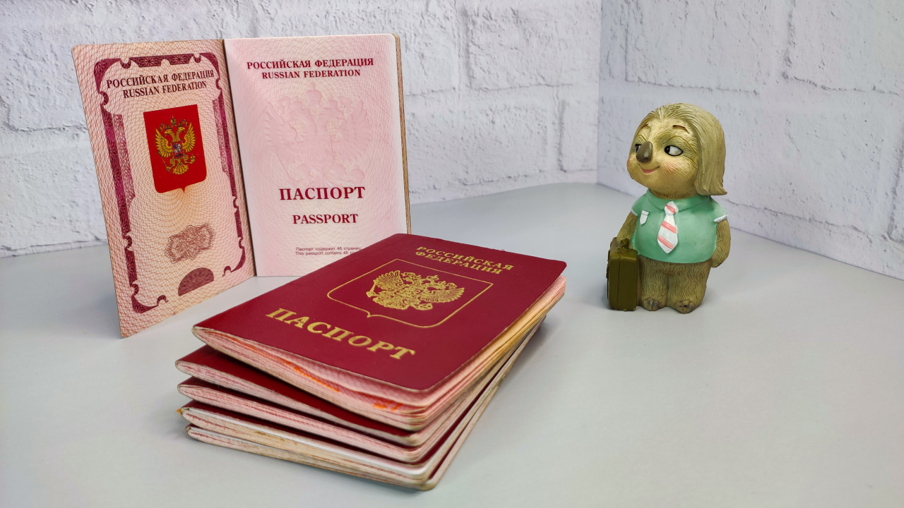 На снимке изображены загранпаспорта Российской Федерации, часть которых сложена стопкой, а один раскрыт на первой странице. Рядом установлена фигурка зверя с чемоданом, символизирующая путешествие и пересечение границ. Композиция подчёркивает роль паспорта как главного документа для международных поездок и иллюстрирует тему туризма и миграции.