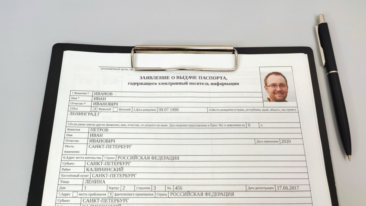 На фотографии показан фрагмент анкеты на получение заграничного паспорта гражданина РФ. Документ закреплен на черном планшете с металлическим зажимом, рядом видна ручка. В правом верхнем углу анкеты прикреплена фотография заявителя. На бланке читаются основные поля: фамилия, имя, отчество, дата рождения, место рождения, адрес проживания. Кадр демонстрирует процесс подготовки к подаче документов для оформления паспорта нового поколения. Снимок иллюстрирует тему государственных услуг, миграции и официальных документов.