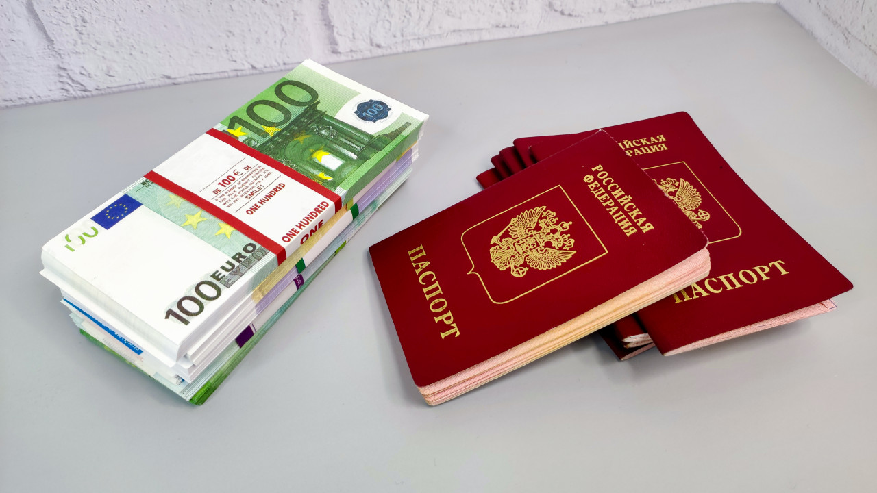 На фото изображена пачка банкнот номиналом 100 евро, перевязанных банковскими лентами, расположенная на белой поверхности. Рядом лежит несколько заграничных паспортов Российской Федерации бордового цвета с гербом на обложке. Композиция символизирует международные поездки, финансовые траты и визовые процедуры, где денежные средства и документы необходимы для путешествий за границу. Снимок может использоваться для иллюстрации тем, связанных с туризмом, финансами, миграцией и государственными услугами.