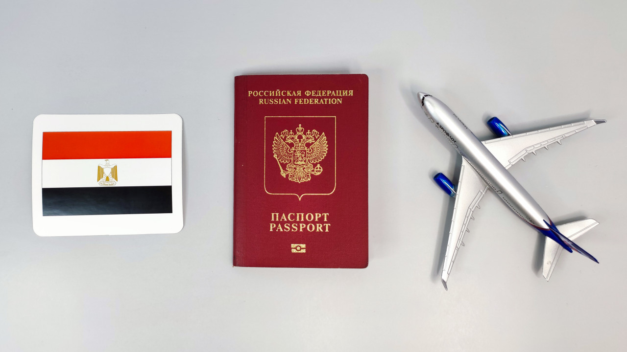 На фото изображен российский заграничный паспорт, расположенный между карточкой с изображением государственного флага Египта и моделью пассажирского самолета авиакомпании «Аэрофлот». Композиция символизирует международные поездки и авиаперелеты из России в Египет. Фото может использоваться в иллюстрациях к материалам о туризме, визовых процедурах, перелетах и путешествиях россиян в арабские страны.