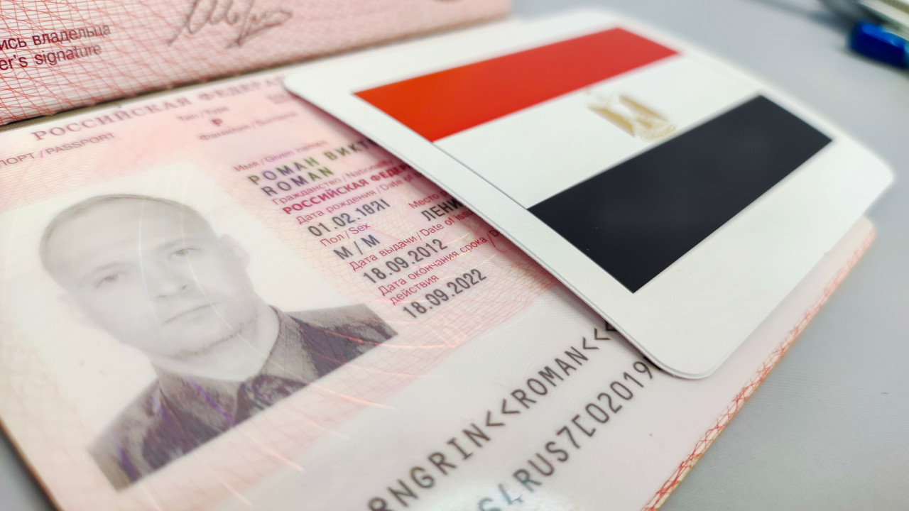 На снимке крупным планом показан разворот российского заграничного паспорта с фотографией и персональными данными владельца. Рядом частично видна карточка с изображением государственного флага Египта. На паспорте различимы дата выдачи и срок действия, а также машиночитаемая зона. Фото иллюстрирует тему международных поездок, оформления виз и путешествий в Египет.