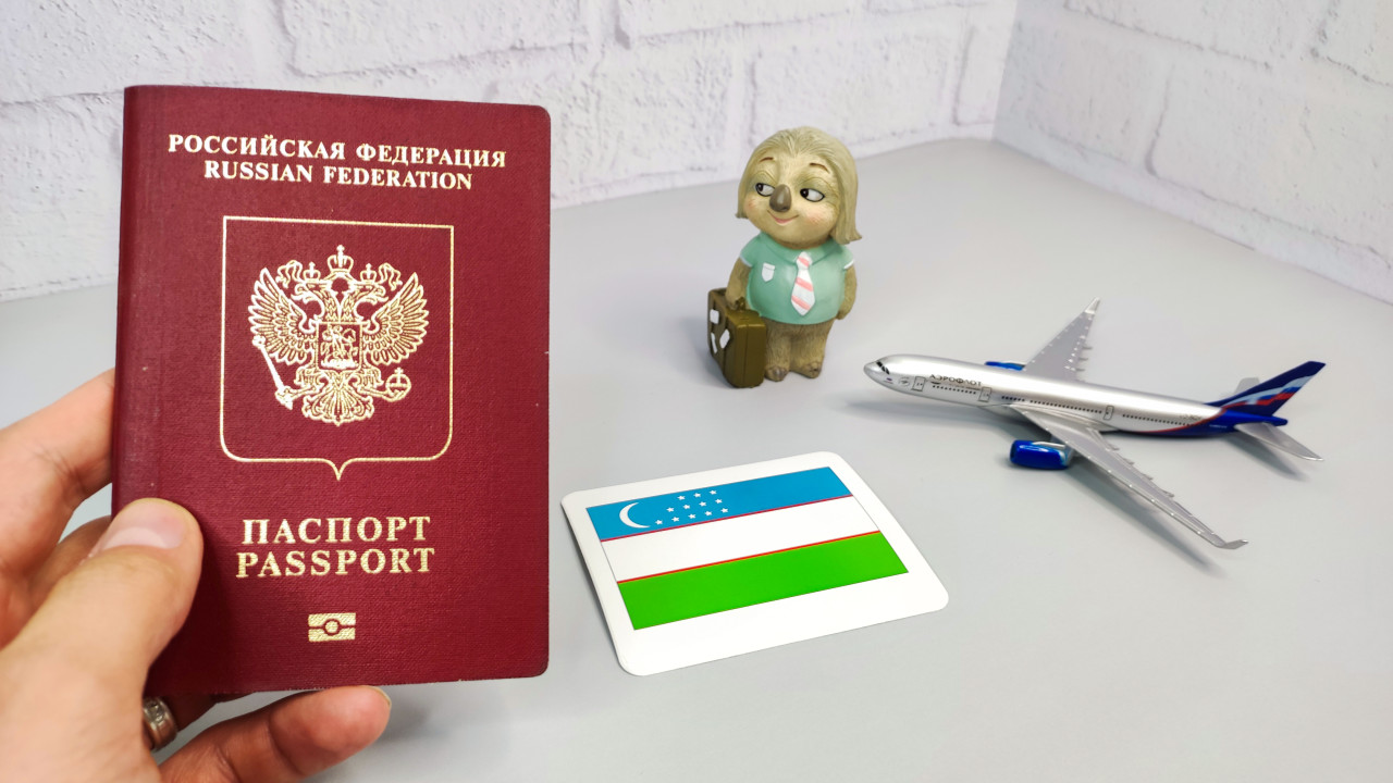 На фото изображен российский заграничный паспорт, который держат в руке. Рядом расположена карточка с изображением государственного флага Узбекистана, фигурка персонажа с чемоданом и модель самолета авиакомпании «Аэрофлот». Композиция символизирует международные перелеты и путешествия между Россией и Узбекистаном.