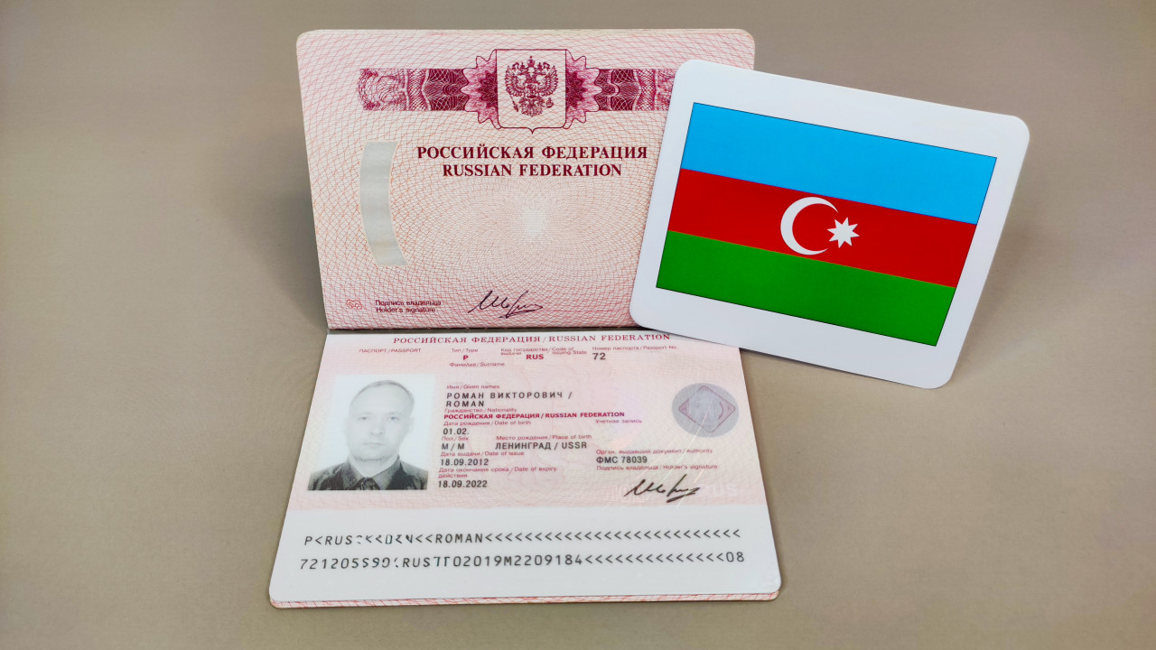 На фотографии изображен разворот российского заграничного паспорта с персональными данными владельца. Рядом стоит карточка с изображением государственного флага Азербайджана. На паспорте видны фото владельца и машиночитаемая зона. Снимок подчеркивает тему международных путешествий и поездок в Азербайджан.