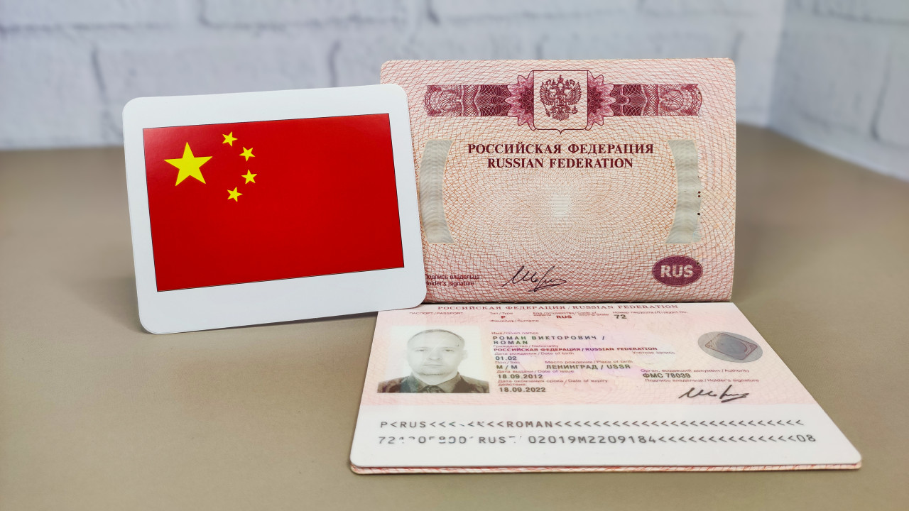 Российский загранпаспорт и флаг Китая