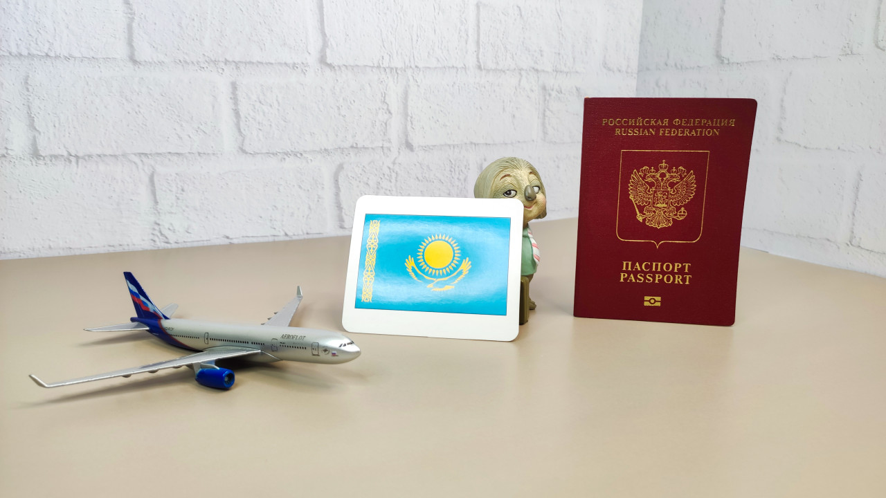 Загранпаспорт РФ, карта с флагом Казахстана и модель самолёта