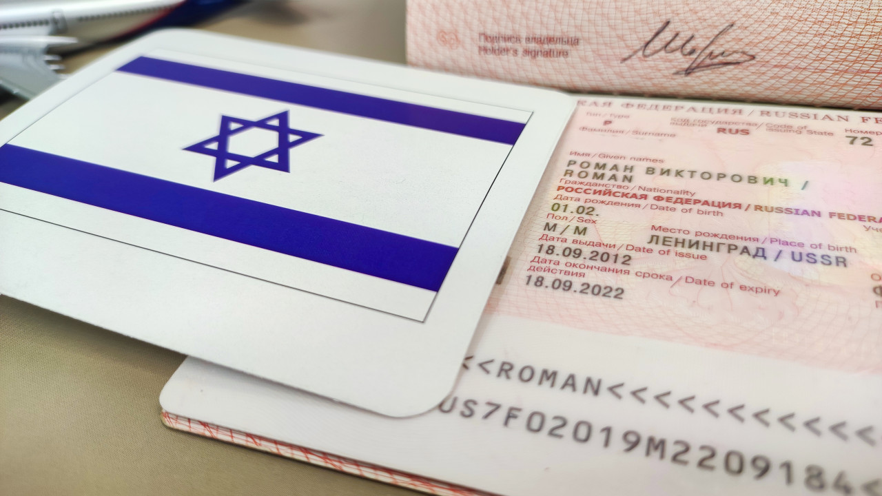 Загранпаспорт РФ и карта с флагом Израиля крупным планом
