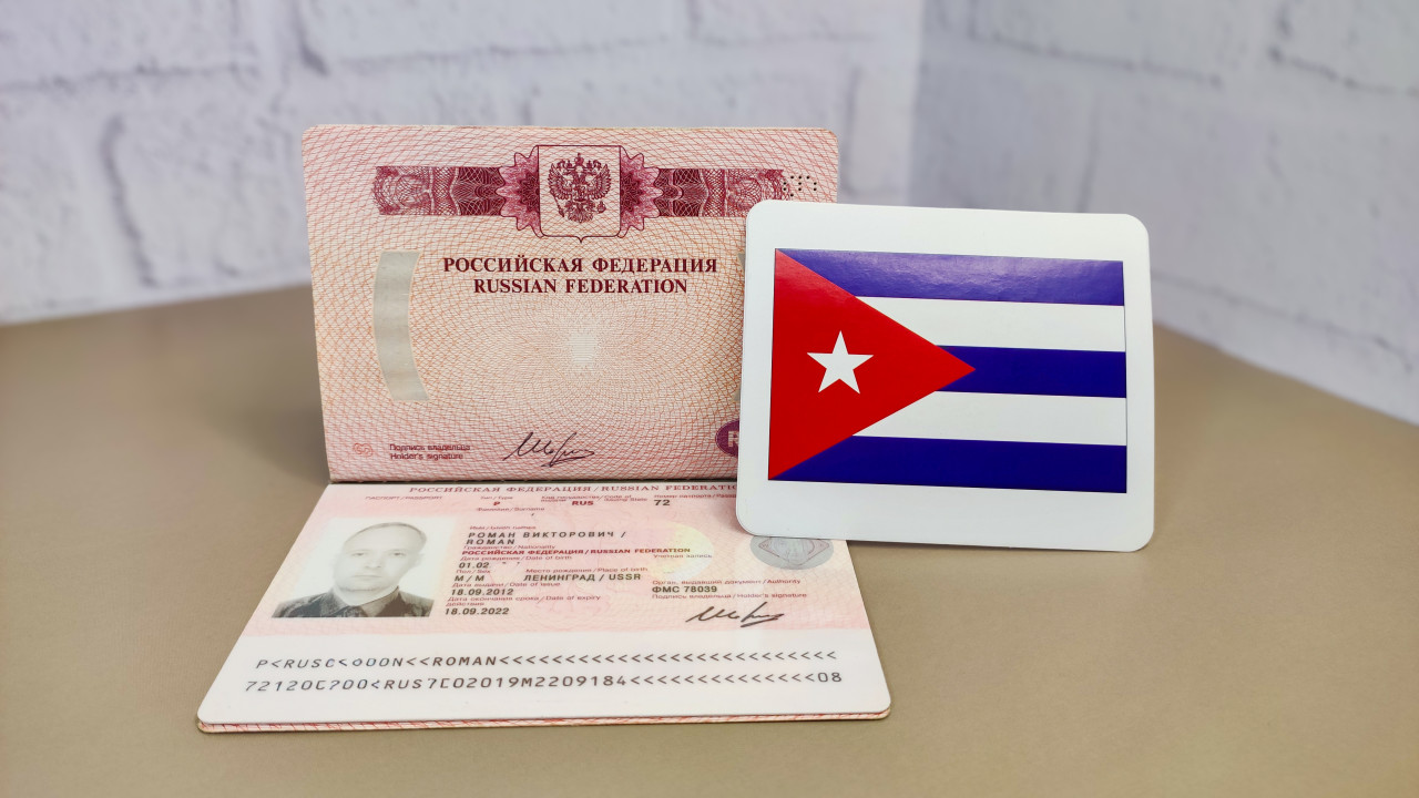 На фото изображён развёрнутый заграничный паспорт Российской Федерации с персональными данными владельца, рядом находится карта с изображением государственного флага Республики Куба. Флаг Кубы был утверждён в 1902 году, он состоит из пяти полос белого и синего цвета, красного треугольника и белой звезды. Снимок символизирует международные поездки, визовые процедуры и подготовку к путешествиям.