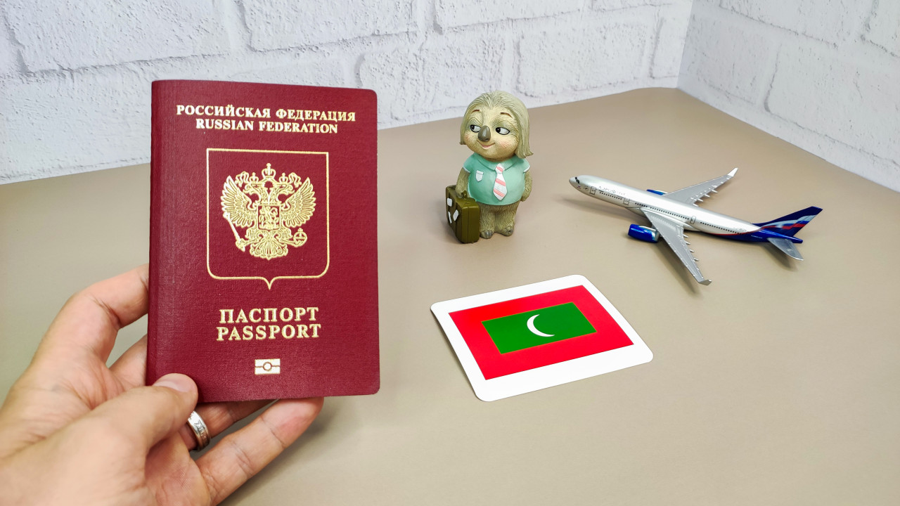 На фотографии изображён заграничный паспорт Российской Федерации, удерживаемый рукой, рядом расположена карта с изображением государственного флага Мальдивской Республики, а также фигурка с чемоданом и модель самолёта. Снимок символизирует международные поездки, визовые процедуры и туристические перелёты на Мальдивы.