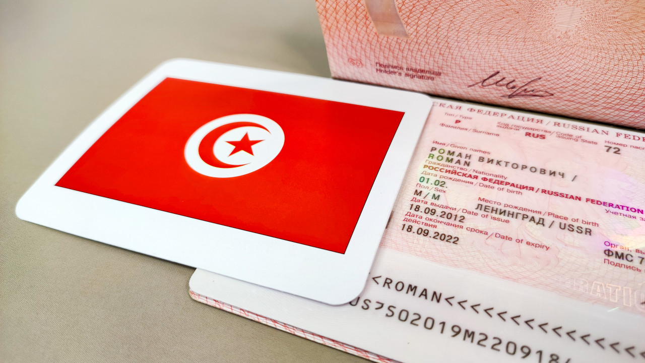 Загранпаспорт РФ и флаг Туниса крупным планом