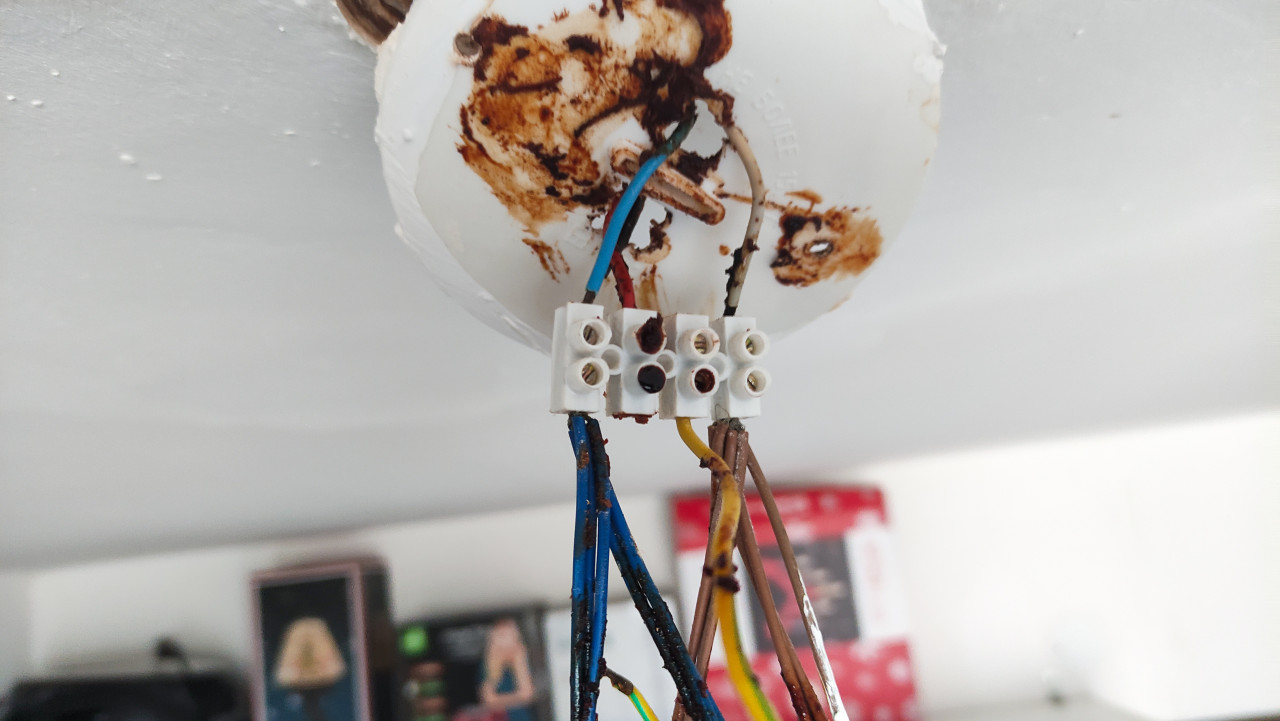 На фото показано соединение нескольких электрических проводов, зафиксированных в клеммной колодке. На пластиковой крышке и потолке видны следы ржавчины и загрязнения, изоляция частично повреждена. Снимок иллюстрирует дефекты электромонтажных работ и может использоваться в материалах по технике безопасности, строительных экспертизах и учебных пособиях по контролю качества инженерных систем.
